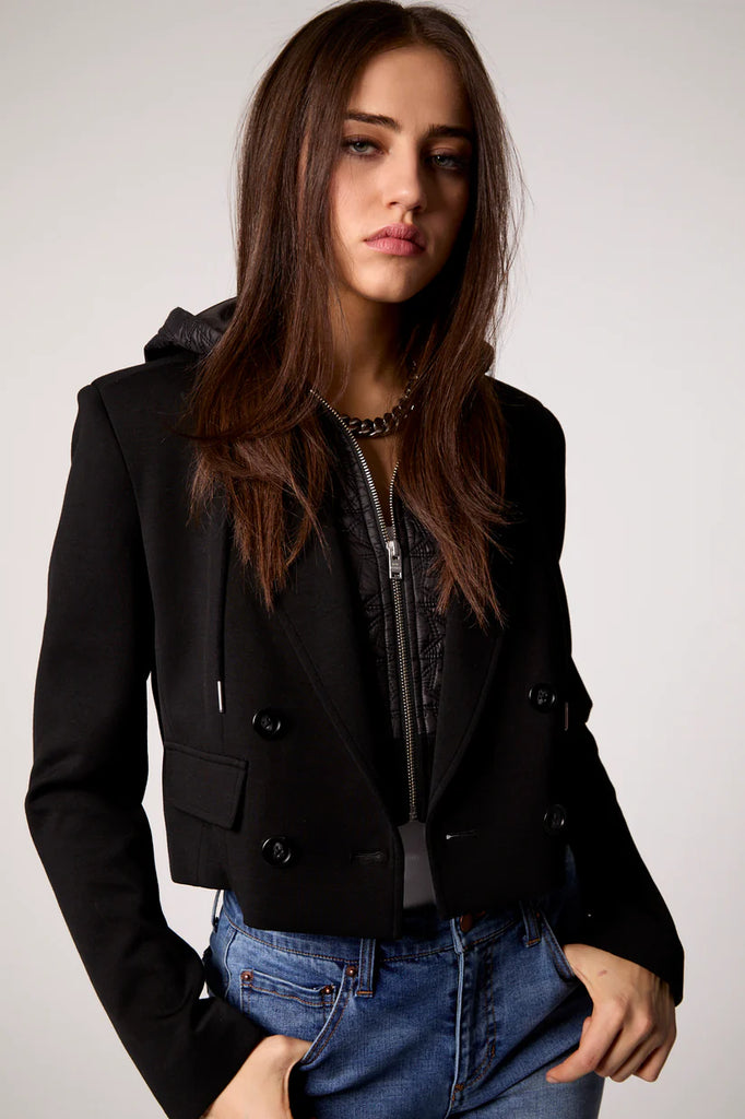 Classic cropped blazer that can be worn two ways with or without removable hooded insert.