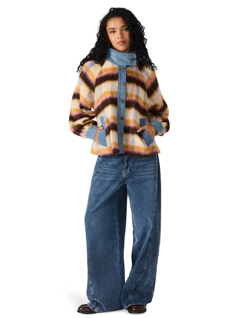 Make a bold statement with the Steve Madden Kaylen jacket, where vibrant stripes meet cozy wool-blend comfort. This playful piece features a classic collared V-neckline, button-down front, and buttoned cuffs that blend timeless tailoring with an easy, relaxed fit. Practical side pockets and a fully lined interior keep you warm and organized through transitional seasons. Perfect for layering over your favorite tees or dresses, this striped stunner transforms any outfit into something fun and effortlessly chic.