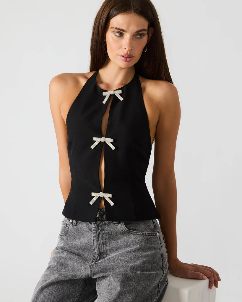 The JUVIA TOP BLACK features a sleek halter design that elegantly contours the neckline. Its refined bow detail adds a subtle statement of sophistication, making this top a versatile choice for both casual and upscale settings. Crafted to enhance your silhouette, the top merges style with expert tailoring for a polished look.