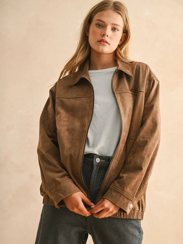 Crafted from luxurious suede, this oversized bomber jacket delivers effortless sophistication with its relaxed silhouette and refined construction. The generous fit creates a contemporary aesthetic perfect for layering. Our model, standing 5'7½", wears a size S with measurements of 33" bust, 24" waist, and 34" hips, showcasing how the jacket's intentional oversizing complements various frames while maintaining an elevated, polished appearance.